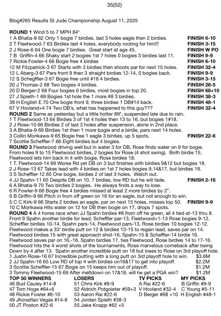 27 J Spieth-1 69 Bogies 1st hole the 1 more #8 3 birdies. FINISH 38-3