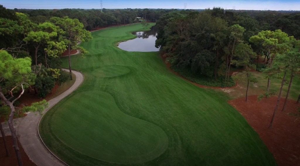 #16 MOCCASIN 460 Yard Par 4 One of the hardest holes on the PGA TOUR. Dogleg right with narrow fairway bordered by water on right and trees on left and an elevated green.