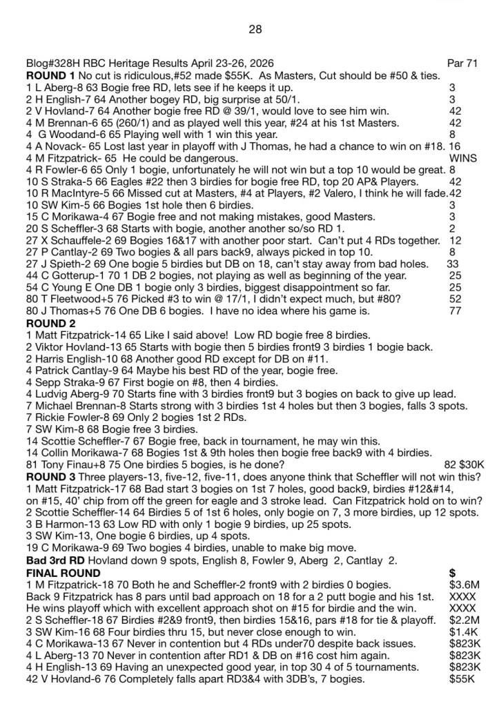 Blog#328H RBC Heritage Results April 23-26, 2026 Par 71