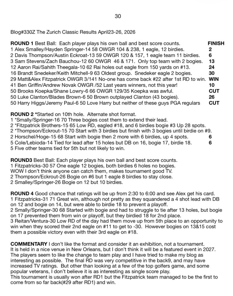 Blog#330Z The Zurich Classic Results April23-26, 2026